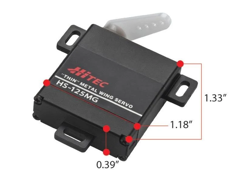 The analog HS-125MG is truly a super thin servo measuring 1.2” x 0.4” x 1.3”. Featuring Hitec’s MP Gear, the HS-125MG is very durable, and a perfect fit in the slim wings of today’s high performance gliders.
